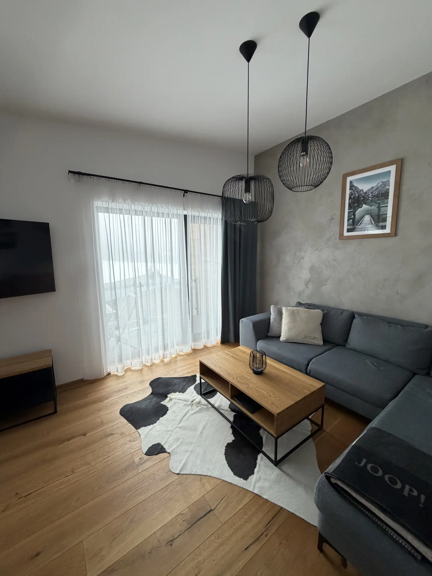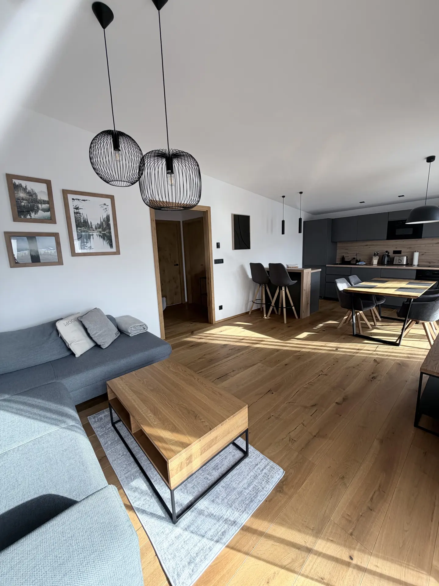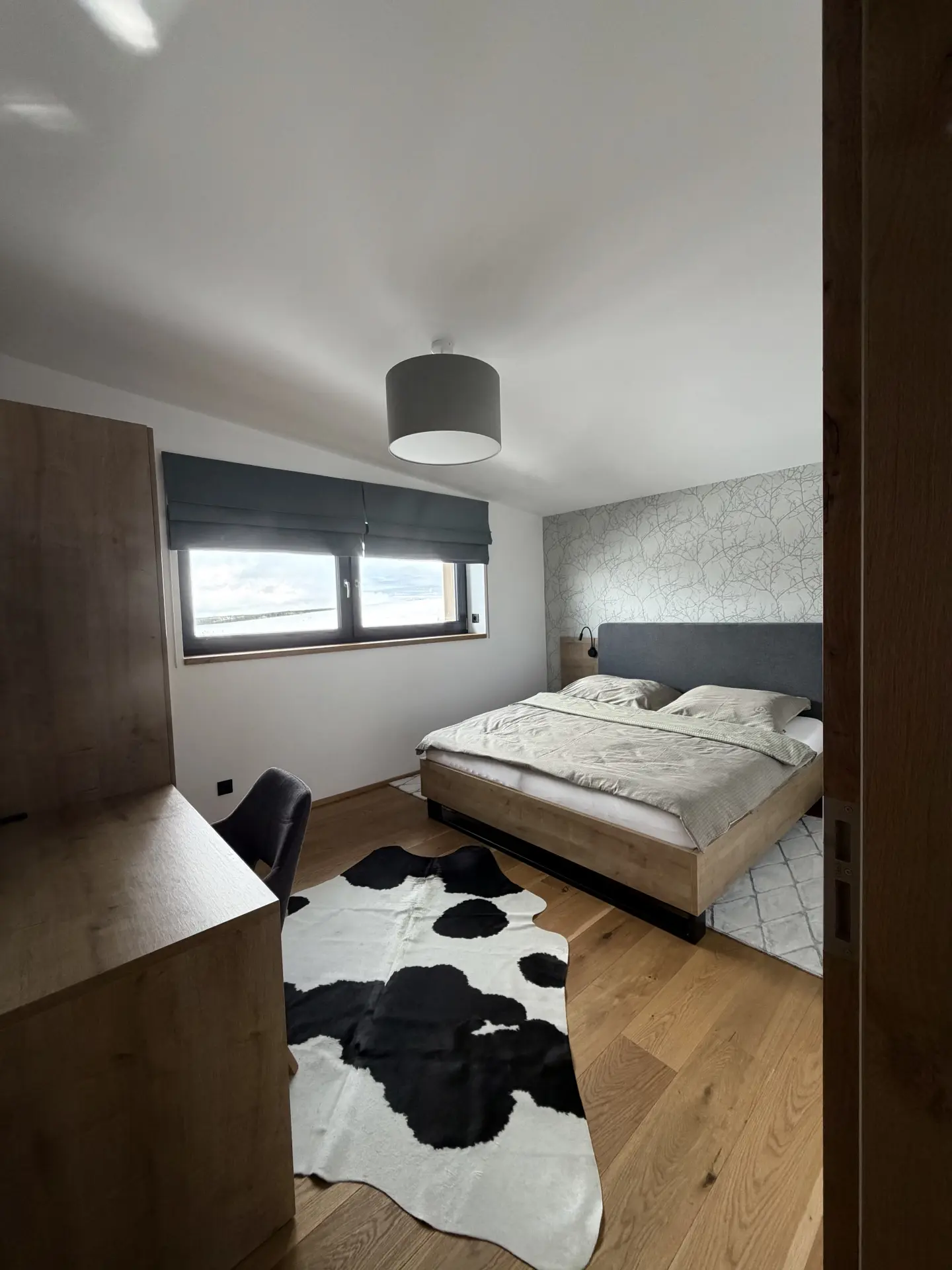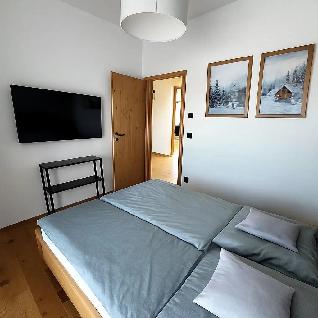 Prostorný apartmán ve 3. poschodí se 2 ložnicemi a balkónem s úchvatným výhledem .